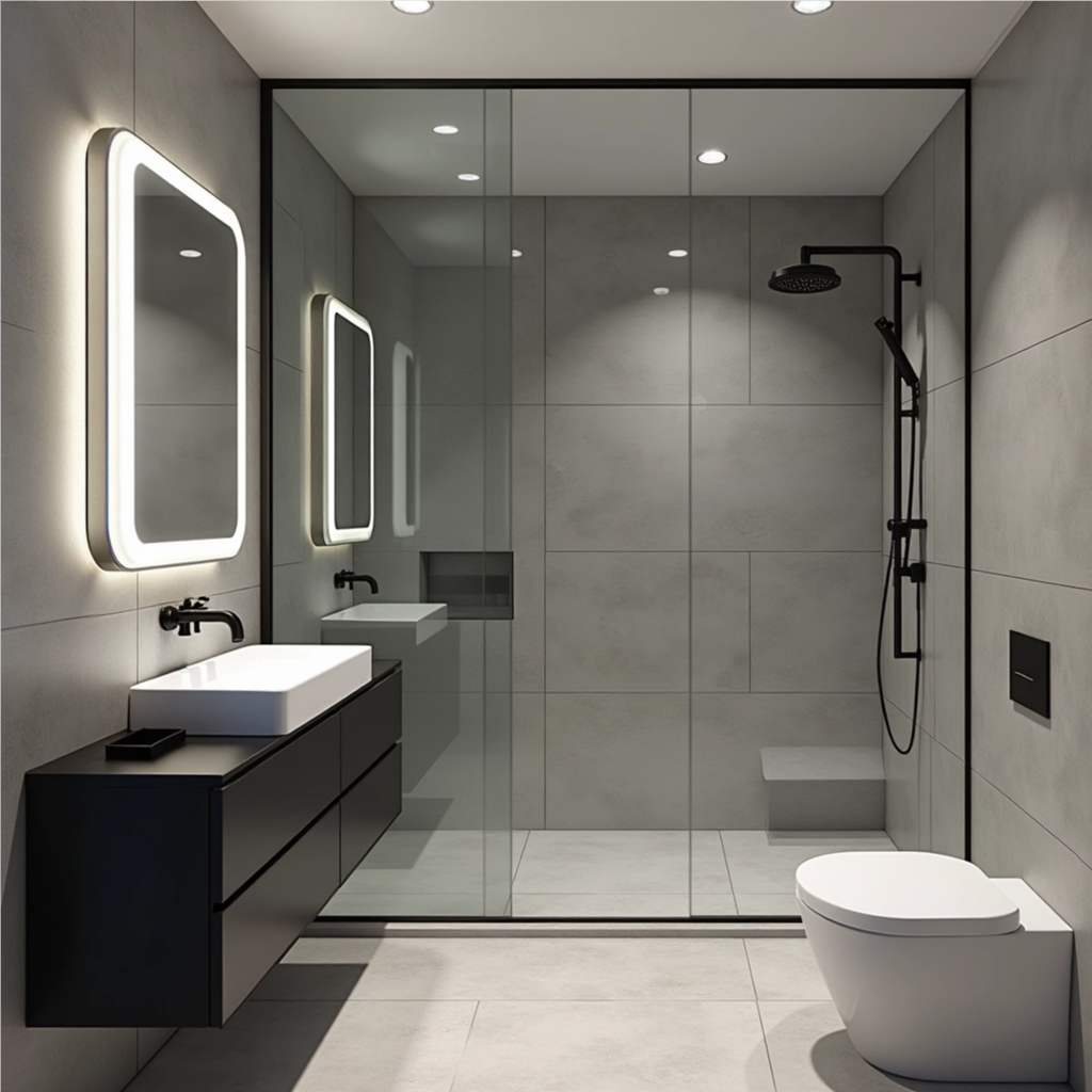 Think sleek lines, floating vanities, and smart features.