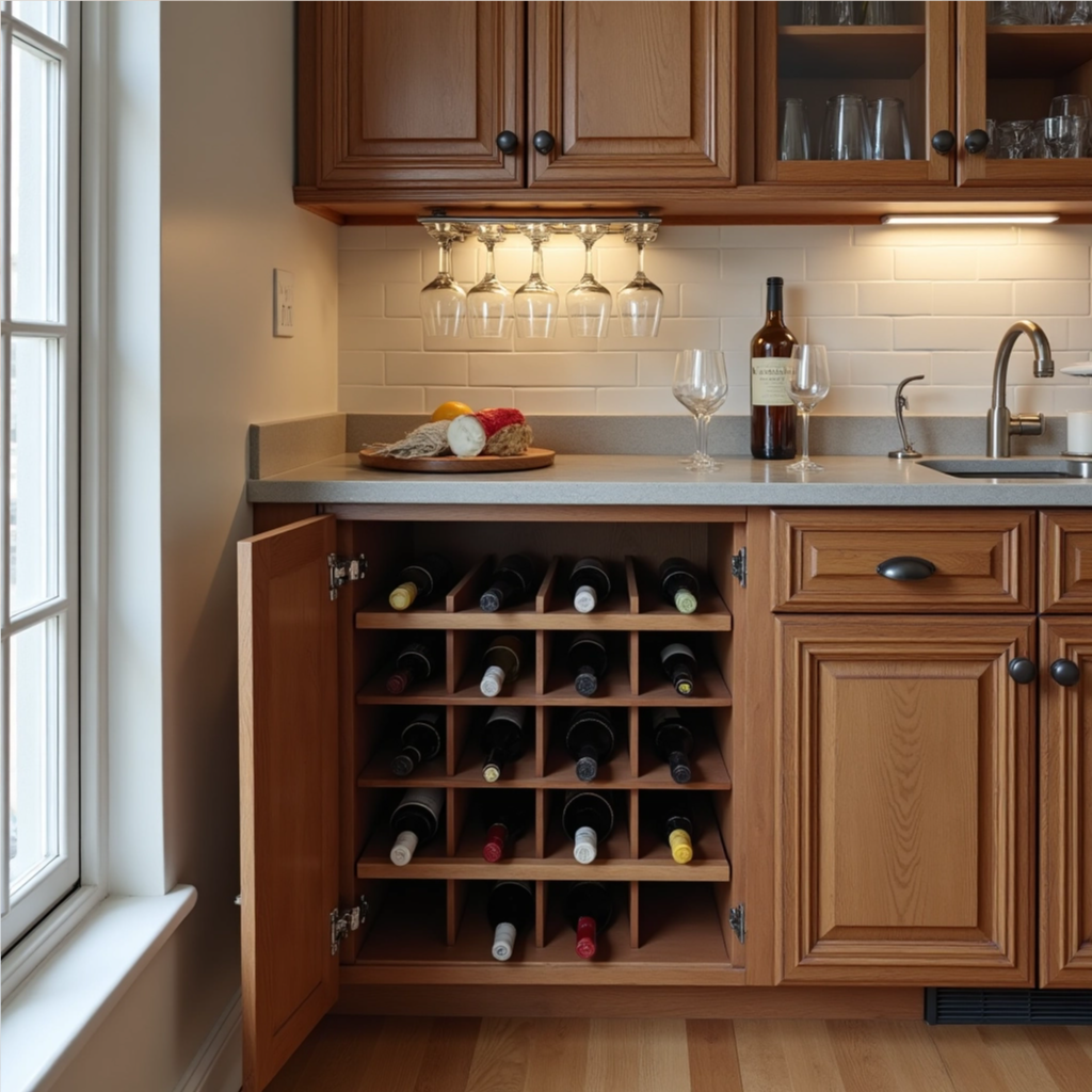 Elegant, functional lower cabinet storage for your favorite bottles and glasses. Adds elegance to your kitchen.