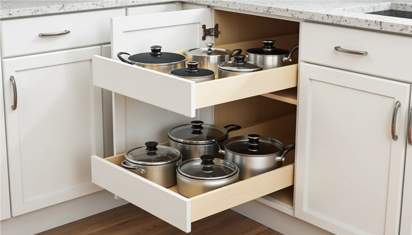 Slide-out trays that bring everything to you—no more digging in dark cabinets. Perfect for pots, pans, and small appliances.