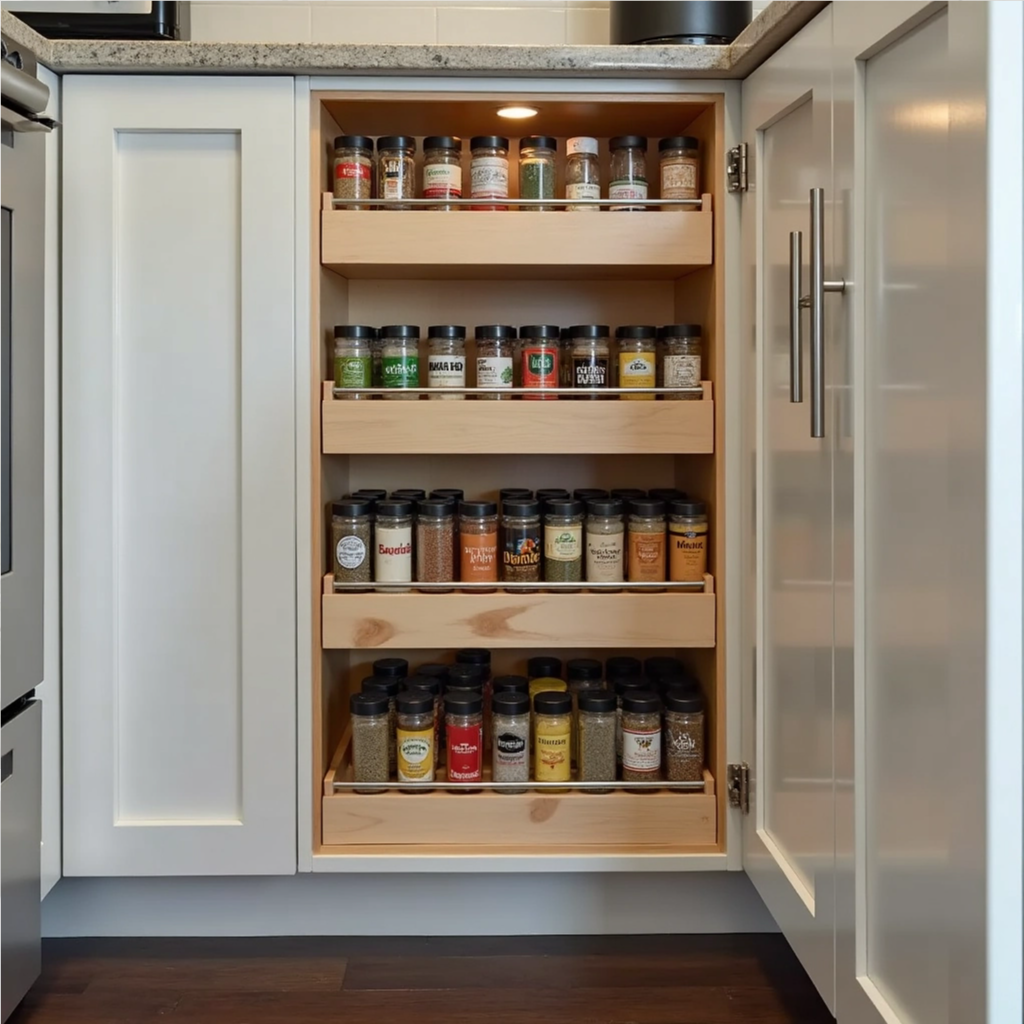 Slim pull-outs that keep spices organized, visible, and right at your fingertips.