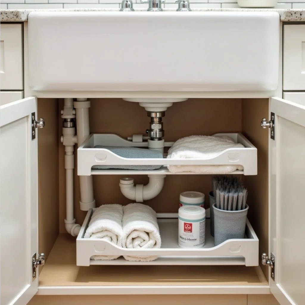 Optimize space around plumbing with sliding trays and tiered shelves for cleaning supplies.